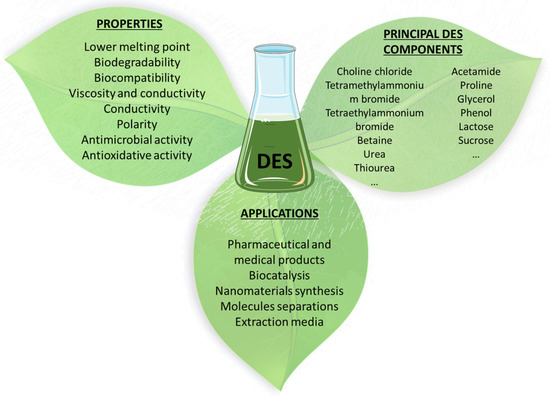 Due to the nature and versatility of DESs, these mixtures are attracting attention from the academic and industry sectors. It has been demonstrated that DESs can be used for many applications such as synthesis [18,19,20], separation processes [21,22], extraction [23,24,25,26,27,28], biocatalysis [29], nanomaterials, biotechnology [12,13], electrochemistry [30,31], food [32], cosmetics, pharmaceuticals [33,34,35,36,37,38], or as a biofuel [12,14,16,25,39]. DESs are also useful in the pharmaceutical industry as excipients for the delivery of hydrophobic drugs or as a vehicle [40]. In fact, the pharmaceutical industry requires the use of organic solvents as media for poor soluble drugs and DESs seem to be promising alternatives in this area [33]. Considering some of these properties, in this work, a revision focused on the health field applications was carried out. Figure 1 shows the most important DESs, properties, and main applications of this type of mixture.
