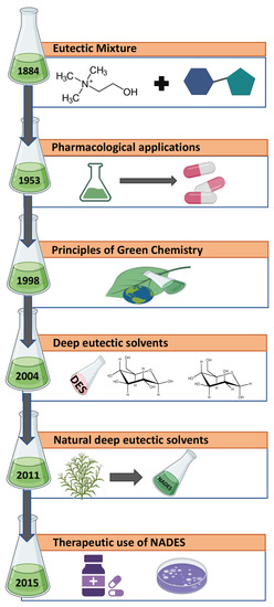 In fact, the use of adequate media for dealing with active pharmaceutical ingredients (APIs) with a poor water solubility is one of the most important challenges for the pharmaceutical industry. It is well known that solubility has a direct relationship on a therapeutic effect of a drug [43]. In addition, in the last few years, several studies have focused on the use of eutectic mixtures in the pharmaceutical area with the aim of improving the solubility and bioavailability of drugs [40,44]. In Figure 2, a scheme of the evolution of these new solvents is shown.
