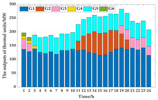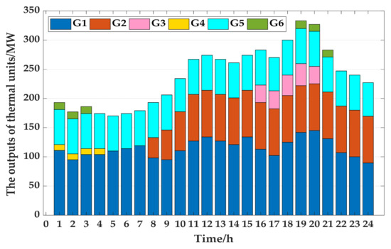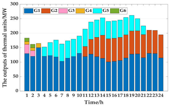 Usually, the shutdown cost of thermal units is set as a smaller constant independent of the continuous operation period, while the startup cost is set as an exponential function of the time constant for the already shutdown time. Here, the startup and shutdown costs of the units are simplified as fixed parameters.