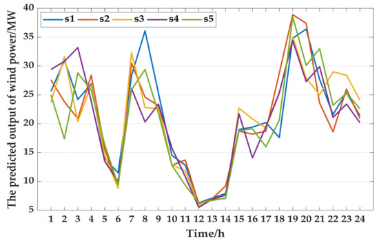To address the uncertainty of the wind power forecast, the Monte Carlo simulation (MCS) method is used to generate the initial scenarios [25]. Here, we set the predicted wind power output at each time of the day as .