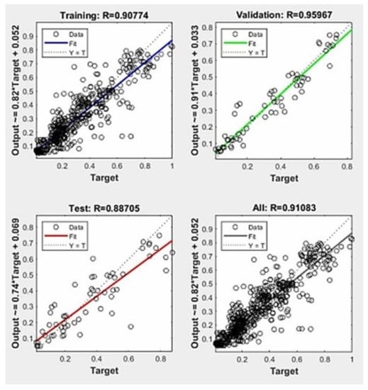 The conducted simulations show that neural network no. 24 demonstrated the smallest root mean square error (MSE = 0.00411) and the highest correlation coefficient (R = 0.95967) (see Table 4). In this case, the samples were randomly divided into the following sets: for training, 80 % of samples; for validation, 10% of samples; and for testing, 10% of samples. Figure 1 shows ANN regression plots between outputs and target samples. The R values in each case are greater than 91%. Therefore, the fit is reasonably good for all data sets. Additionally, R for the water consumption was estimated as 0.90774 for training, 0.88705 for testing, and 0.95967 for validation data sets.