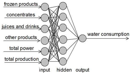 Figure 2 presents the optimal structure of the neural network. The neural network consisted of three layers (input, hidden, output). The input layer contained six decision variables: frozen products (x1), concentrates (x2), juices and drinks (x3), other products (x4), total power (x5), and total production (x6). Water consumption (y) was in the output layer. As shown in Figure 2, 6 neurons were located in the hidden layer. The activation function, both in the hidden and output layers, was the “log-sigmoid” function. Therefore, the topology with six inputs, six neurons with one hidden layer, and one output (6-6-1) was applied for predicting water consumption.