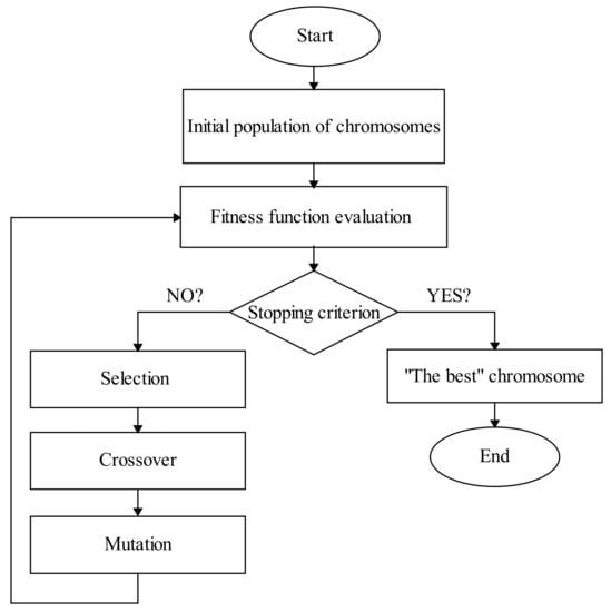 Genetic algorithms are an optimization method that relies on the natural processes of evolution. The main genetic parameters are crossover and mutation. These parameters determine the selection of the best individuals for the next generation (iteration). The main steps of the genetic algorithm are presented in Figure 3. These are selection, calculation of the objective function, and application of genetic operators (crossover and mutation). After each iteration, all steps are repeated until the best solution (chromosome) is obtained.