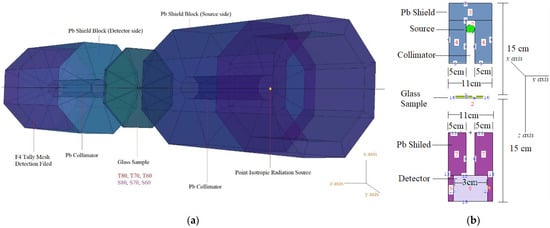 MCNPX is a general-purpose Monte Carlo code that can be used in different types of radiation transport simulations in nuclear, medical, and particle physics studies. This code enables the user to provide the simulation’s necessary characteristics, including geometrical details, material properties, and the radiation source’s energy and type, such as narrow beam, point isotropic, and so on. Our study defined a general gamma-ray transmission setup, which can provide basic information, such as the intensity of attenuated gamma-ray in terms of determining the linear attenuation coefficients. We developed a fundamental gamma-ray transmission setup in our research that may give fundamental information, such as the intensity of the attenuated gamma-ray when calculating the linear attenuation coefficients. Accordingly, an INPUT file was created considering cell card, surface card, and source information []. In the cell card, we identified the cells that were utilized and their densities and borders. Geometrical features of the boundaries have been specified in the surface card using the x, y, and z axis positions. Figure 1 depicts the modelled simulation setup along with its 3-D and 2-D views obtained from MCNPX visual editor. As it is seen from Figure 1, we set the locations of the used equipment considering their roles for gamma-ray transmission simulation. For instance, a gamma-ray attenuator has been placed between the source of point-isotropic radiation and the detecting field (F4 Tally Mesh). Additionally, two large Lead (Pb) blocks have been designed to absorb scattering gamma-rays, which may increase detection consistency. We would like to emphasize that simulations were performed on each glass sample using photon energy ranging from 0.015 MeV to 15 MeV. Finally, it is worth noting that each glass sample received a total of 108 particle tracks (Number of History) with various photon energies. After running all simulations, the MCNPX output exhibited a relative error rate of less than 1%. MCNPX simulations were performed in LenovoTM ThinkStation620, which has a Ryzen™ Threadripper™ Pro 3995WX (2.7 GHz, 64 Cores, 256 MB Cache) processor. Next, a Phy-X/PSD platform was used to determine the attenuation coefficients. The main difference between the MCNPX and Phy-X/PSD is their format. On the one hand, MCNPX is a Monte Carlo algorithm that needs user definitions for almost every element of the system, including material design, simulation environment, physics list used, and variance reduction methods. On the other hand, Phy-X/PSD is a platform that delivers results immediately as a consequence of mathematical computations performed against a predefined database. Additional information may be acquired from the original article, which is available elsewhere [].