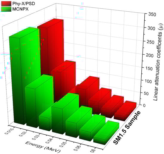 On the other hand, there is a direct correlation between a computer’s performance and its relative error. Additionally, there are many sub-titles that may affect the consistency of the Monte Carlo simulation results. However, Phy-X/PSD is a web-based platform that enables users to get different shielding characteristics based on just the material description and energy range. It is worth noting that the total relative variation between the findings ranged from 1.2% to 2.9%. After checking the consistency of the tools, we proceed to the following parameters. Meanwhile, our results indicate that the SM1.5 sample exhibits the highest linear attenuation coefficients throughout the whole energy range. This may be explained partly by the glass densities, as well as the chemical compositions listed in Table 1. Figure 3 illustrates the difference in glass densities. As can be observed, density levels significantly increased from SM0.2 to SM1.5. As seen in Table 1, increasing the Sm2O3 reinforcements also improved the glass density. Our findings indicated that adding Sm2O3 to HMO glasses enhanced their density and, therefore, their linear attenuation coefficients.