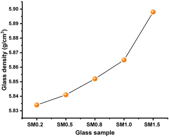 Variation of glass densities as a function of glass type (i.e., Sm2O3 %mol).