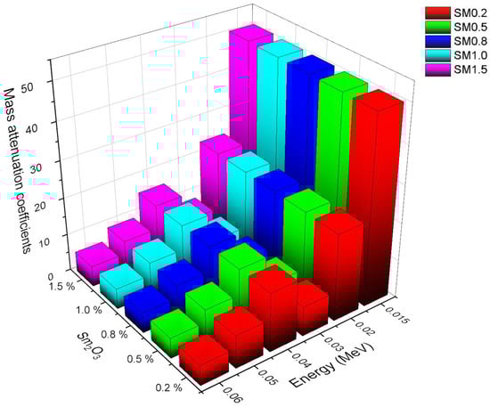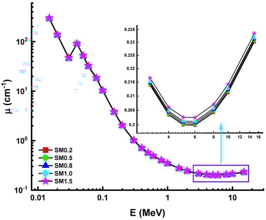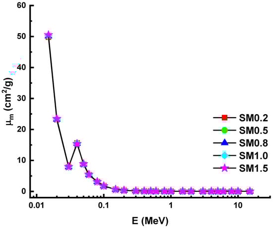 At this moment, Figure 4 depicts the changes in µ values as photon energy (MeV) function. From 0.015 MeV to 0.03 MeV, a sharp decrease was seen. Following that, a sharp peak near Te’s k-absorption edge was found. This demonstrates that Te is present in all glass samples. We would like to emphasize that the results of the glass samples were near to each other due to the low molar variations in the Sm2O3 additive. Nevertheless, adding the Sm2O3 additive had a synergistic impact on the linear attenuation coefficients of SM glasses. Our findings clearly showed that the SM1.5 sample has the maximum µ values at all energies. On the other hand, the term mass attenuation coefficient (µm) refers to the density-independent attenuation coefficient, which contains critical information about the material’s shielding performance as a function of its elemental structure.