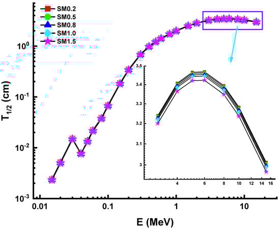 According to findings, SM1.5 has the maximum µm values among the studied SM glass samples. In this study, half value layers (T1/2) of SM glasses were also determined between 0.015 MeV and 15 MeV. The term T1/2 is crucial for determining the thickness of a shielding material needed to reduce the initial gamma-ray intensity to half Figure 7. It is worth noting that the T1/2 term has an inverse relationship with the µ value, which implies that material with higher µ values may also offer lower T1/2 values. Additionally, a material with the lowest T1/2 values may be regarded as a clear indicator of gamma-ray superiority among the studied material group. Our results indicated that the SM1.5 sample with the highest Sm2O3 additive has the lowest T1/2 values at all energy levels. For example, T1/2 values were reported as 2.00553 cm, 2.00262 cm, 1.99835 cm, 1.99359 cm, and 1.98160 cm for SM0.2, SM0.5, SM0.8, SM1.0, and SM1.5 samples at 1 MeV, respectively. At this moment, it can be noted that 1.3% mol Sm2O3 (i.e., from 0.2% to 1.5%) decreased the T1/2 value from 2.00553 cm to 1.98160 cm.