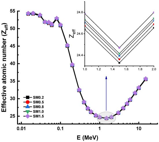 As with pure elements, the atomic numbers of compounds, alloys, and composite materials cannot be represented by a single number in the various energy zones. This number is referred to as the effective atomic number (Zeff) for compounds, alloys, and mixtures, and it changes according to the photon energy []. Figure 8 depicts the variation of Zeff as a function of incident photon energy at all energies. The results indicated that the sample with the highest Zeff value is SM1.5, with the most Sm2O3 in the structure. However, no sharp differences were reported due to the structural similarities between the samples. It should be noted that the minimum difference for Zeff values was reported as 0.07 at 0.04 MeV, whereas the maximum difference was 0.36 at 0.06 MeV.