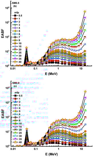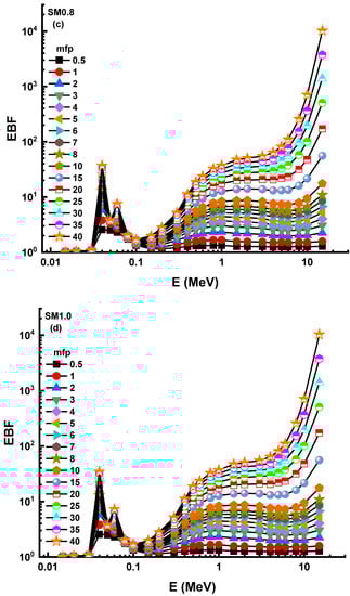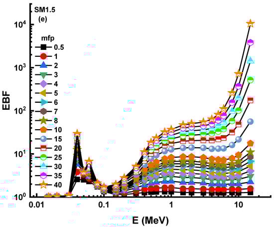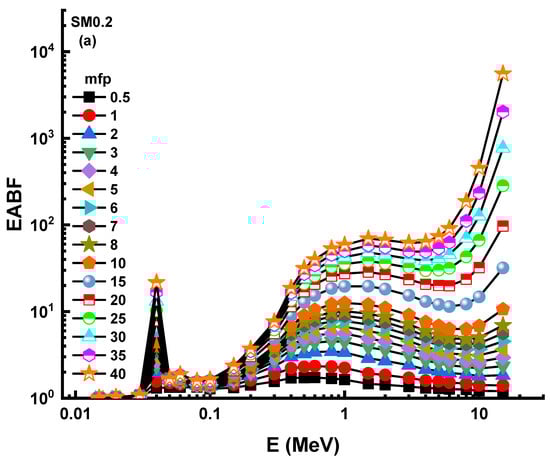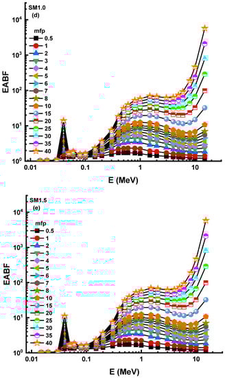 The buildup factor is a correction factor used in shielding computations to account for the effect of scattered radiation and any secondary particles in the medium. If one intends to compensate for secondary radiation accumulation, one must add a buildup factor. The accumulation factor is thus a multiplicative factor that incorporates the contribution of the scattered photons into the reaction to the uncollided photons. Thus, the accumulation factor may be calculated as the ratio of the entire dosage to the uncollided dose-response []. Meanwhile, the term of buildup factor can be classified as to exposure buildup factor (EBF) and energy absorption buildup factor (EABF) []. In parallel to the given description, the lower buildup factor values can be considered a superiority pattern against gamma-rays since the uncollided photon amount in the successful shields would be low. Figure 9 and Figure 10 depicts the variations of EBF and EABF values as a function of energy at various mean free paths (i.e., from 0.5 to 40). The highest values were seen in both EBF and EABF in the mid-energy range, where Compton scattering is the main interaction between the gamma-ray and the material (see Tables S1–S5). In other words, this area has a high amount of uncollided photons. As a result, relatively higher values for the buildup factor are required to correct the transmission calculations. Our results indicate that SM1.5 has the lowest accumulation factors in both EBF and EABF. Thus, incoming gamma-rays may interact with the SM1.5 sample more often than with other samples.