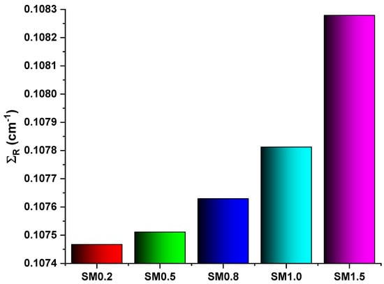 The effective removal cross-section, R (cm2/g), refers to the possibility that a fast or fission energy neutron would undergo the first collision, thus excluding it from the group of penetrating, uncollided neutrons. For neutron energies between 2 and 12 MeV, it is believed to be roughly constant. Moreover, the materials with the highest ∑R values can be considered as superior materaials against hazardous neutron particles. In this study, ∑R values of SM glasses were determined, and the results have been demonstrated in Figure 11. Following the gamma-ray attenuation characteristics, a distinguished synergistic impact of increasing Sm2O3 was eventually found. As shown in Figure 11, the SM1.5 sample clearly differs from the SM0.2 sample. Therefore, one can say that Sm2O3 can be considered a useful tool to improve the gamma-ray and fast neutron shielding properties of HMO glasses.