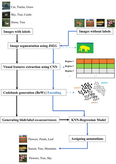 The different phases that constitute our proposed AIA approach. Black solid arrows correspond to training images, whereas the blue ones correspond to test images. All images pass through a segmentation phase using JSEG algorithm, the segmented regions are fed to a CNN for feature extraction, features are encoded, a codebook is generated, and then KNN regression is employed to link blobs with labels and assign new labels.