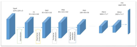 In region-based techniques, the visual characteristics of the image, such as color, texture, and form, are typically extracted from each region. Using local features instead of global ones has been proven to be more effective in image annotation tasks. Nevertheless, appropriate features must be selected to represent the essential substance of the image. For the task of image representation, deep CNNs have recently been shown to outperform, by a significant margin, state-of-the-art solutions that use traditional hand-crafted features. In our study, the learning transfer of off-the-shelf features extracted from a pretrained CNN model has been used to represent the content of each image region. Learning transfer has shown high efficiency in extracting visual features and demonstrated that features with sufficient representative strength can be extracted from the last layers [40,41]. We have opted for a pretrained model for two reasons: the first one is that we do not have a sufficient amount of data or the necessary resources to train a new CNN model; the second reason is to speed up the training process of our model. MobileNet [42] model, shown in Figure 3, has been adopted in the present work since it has proved high performance (both accuracy and rapidness) in many learning transfer-based methods.