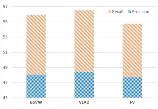 This first scenario aims at tuning the values of our method’s parameters that ensure sufficient performance. We firstly tune the most suitable aggregation method among the three well-known methods: bag of visual words (BoVW), vector of linearly aggregated descriptors (VLAD), and Fisher vector (FV). Figure 4 represents the precision and recall yielded using features encoded by each of the aforementioned aggregation methods.