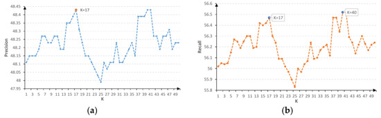 The impact of changing the value of K of KNN regressor on (a) the precision and (b) the recall of our proposed method.