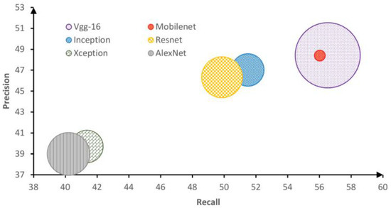 Since our method engages off-the-shelf CNN-based features, we evaluate several CNN models to determine which is the best for our task. The performance is determined not only in terms of precision and recall, but also in terms of time consumed in image processing. Figure 6 shows the impact of using different CNN models on the precision and recall of our proposed method.