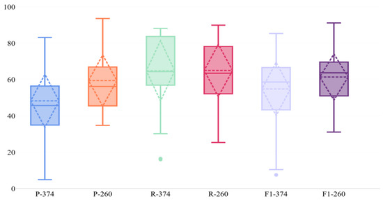 From the first glance, it appears that there is a compromise between precision and recall based on the used number of concepts. With 374 concepts, for instance, our system achieved a recall that is far higher than the precision. When it comes to 260 concepts, however, the precision remarkably improved whereas the recall slightly decreased. As the depicted standard deviation (≈14 in both cases) indicates, our proposed technique aids in the balanced learning of various concepts. With a median of 45.7 in the scenario of 374 concepts, our findings indicate that more than half of the images were annotated with at least two to three accurate concepts, which is a significant number given a large number of concepts (374 concepts). Nonetheless, the number of correctly annotated images with two to three concepts increases substantially in the case of 260 images, resulting in a 75% rate. It should be noted that manually annotating images involves some subjectivity or mistakes, which results in the appearance of certain outliers, as seen in Figure 7.