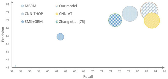 A blob chart of F1 in terms of precision and recall. The experiments were conducted on MSRC dataset, with 22 concepts, between MBRM [27], CNN-THOP [74], SMK+GRM [88], CNN-AT [54], and Zhang et al. [76] on one hand and our proposed method on the other hand.