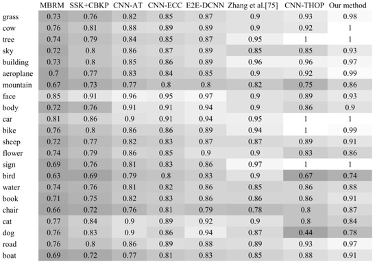 As it appears from Figure 9, CNN-THOP and our method have outperformed the others by yielding perfect precisions with four concepts. Furthermore, our method has achieved more than 0.98 for another three concepts, namely grass, airplane, and bike. If we take the third quantile for both methods (≈0.93 for CNN-THOP and ≈0.99 for our method) as an example, we can deduce that far more concepts have been appropriately grasped by our method than by CNN-THOP. Furthermore, our approach has a standard deviation of 0.7, whereas CCN-THOP has a standard deviation of 0.14, indicating that the former has a better balance in learning concepts, whilst the latter only concentrates on a few of them. The outcomes of this experiment prove that guiding a CNN-based AIA system through a preprocessing of image segmentation could highly improve the results.