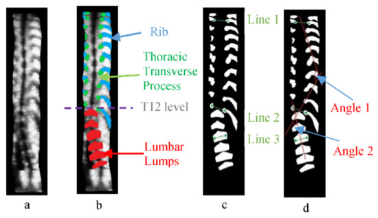 An alternative way of measuring a new parameter, called ultrasound curve angle (UCA), which is equivalent to radiographic Cobb angle [20], is illustrated in Figure 2. A 3D volume projection image is sliced into nine 2D coronal plane images of different depths for scoliosis detection. One such 2D ultrasound spine image is shown in Figure 2a. Figure 2b illustrates the various segments of the spine—the thoracic bony features, rib, T12 level, and lumbar bony features. Figure 2c,d outlines the current methodology used by a medical expert to calculate the UCA. The most tilted thoracic bony features (TBFs) and lumbar bony features (LBFs) are identified by expert judgment. Further steps involve drawing lines through the centre of the identified TBF and LBF pairs (Figure 2c) and allocating lines to measure the UCA (Figure 2d) [20]. Hence, the clear segmentation of bony features is an important step for the UCA measurement process.