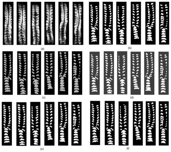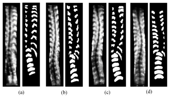 The truth mask for each 2D coronal image was carried out by experts from Hong Kong Polytechnic University. Some sample input 2D coronal images, along with their expert generated truth masks, are shown in Figure 10a–d. The labelling of the truth mask was conducted based on some key features: (1) There should be six lumbar bony features (LBF); (2) the thoracic bony features (TBFs) in the lumbar region are not labelled as they are not generally visible in ultrasound images; (3) if the last pair of TBFs (i.e., the T12 level) is not visible, it is labelled according to the judgment of the experts. The input raw datasets of 109 spine ultrasound images were randomly split into one training set of 79 images and one testing set of 30 images.