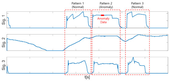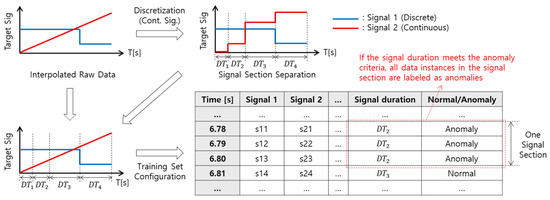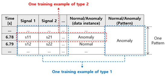 The input/output data structure for training the one-class SVM model consisted of two types. The first type consisted of target data per pattern as input and normal/anomaly per pattern as output (Type 1). The second type consisted of normal/anomaly per data instance of the target signals as output, and the input data were the same as Type 1 (Type 2). The model learned with this configuration determines the normal/anomaly state of the data instance. Training examples for each type are shown in Figure 12. However, for vehicle data, the duration of a particular situation can be a criterion for normal/anomaly status. For example, for hydraulic pressure following errors in engine clutches, the errors above a certain level for a short time may occur because it takes a certain amount of time for hydraulic pressure to be generated. This situation should be seen as normal. As configuring normal/anomaly per data instance as the output of the model makes it difficult to determine normal/anomaly for the duration of this situation, we configured the signal duration () as shown in Figure 13 as additional input data to the model. As shown in the figure, the signal duration was derived by separating the interval of the signal based on when any target signals change, and for this, continuous signals should be discretized. If the configured signal duration satisfies an anomaly criterion, all data instances in the corresponding signal interval are labeled as anomalies.
