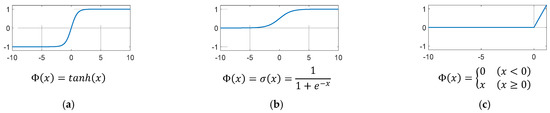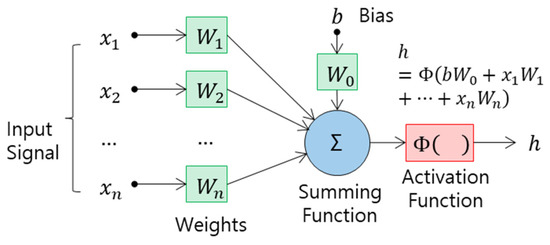 MLP is the neural network in the form of sequentially attaching several layers that are composed of perceptrons. Figure 4 shows the structure of the perceptron [47]. As shown in Figure 4, a single perceptron adds up all the weighted inputs and biases and then calculates an output by inputting the summed value to an activation function, shown in Figure 5.