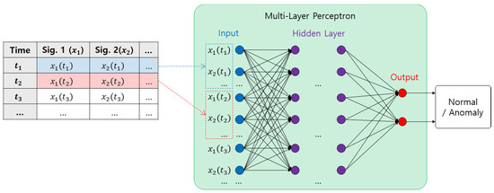 We trained the engine clutch engagement/disengagement anomaly detection model using MLP by configuring the input/output structure as shown in Figure 6. Because MLP can receive one-dimensional input data only, the target signals for each pattern were configured and inputted in one dimension, as shown in Figure 6. Although MLP receives one-dimensional data, we expected MLP to learn data patterns because units of hidden layers are all connected to input nodes. There are also studies where MLP learned time-series data [48,49]. Before inputting data to MLP, because the length of the target signal in a pattern may be different for each pattern, it is necessary to match the length of the signal and then input it into the network. Accordingly, the data were constructed in one dimension after filling the insufficient data points with zeroes in line with the pattern that had the longest data length. Equation (1) below is the example of a pattern with a length of 5, filling the data with a length of 10. In the equation, is the preprocessed target signal vector, and is the target signal vector that is inputted into the network; configured in this way is reorganized into one dimension in the way shown in Figure 6 and input into the network. We composed the output as normal/anomaly per pattern to determine normal/anomaly considering data trends over time. The two output units shown in Figure 6 are in the case of normal and in the case of anomaly. This output unit configuration follows the setting of the Matlab MLP training app we used. This app determines the number of output neurons as much as the number of output classes.