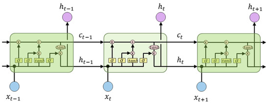 A recurrent neural network (RNN) is mainly used to learn ordered data or time-series data such as natural language processing and speech recognition [50,51,52,53,54,55,56,57,58,59]. However, RNN has the vanishing gradient problem that significantly reduces the learning ability when the distance between the previous output and the point where it uses the information from that output is far away [60,61]. LSTM is the proposed neural network architecture to solve this vanishing gradient problem. An LSTM network is composed of connected multiple LSTM cells as shown in Figure 7 [62].