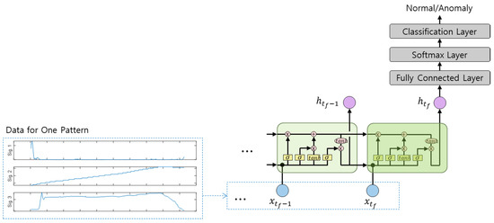 We trained the engine clutch engagement/disengagement anomaly detection model using LSTM by configuring the input/output structure as shown in Figure 8. The network was constructed by sequentially connecting the LSTM layer, fully connected layer, softmax layer, and classification layer, as shown in the figure. We inputted target signals per pattern into the LSTM layer and configured normal/anomaly per pattern as the output of the network. We also matched the LSTM’s input data length to the length of the longest pattern using Equation (1). The data were normalized so that the average of the input data is zero before inputting the data.