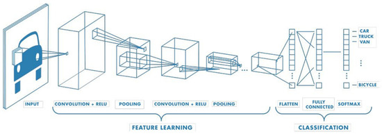 A CNN is the network architecture that learns directly from data, eliminating the need for manual feature extraction. CNNs are particularly useful for finding patterns in images to recognize objects, faces, and scenes. They can also be quite effective for classifying non-image data such as audio, time series, and signal data [64,65,66,67,68,69,70,71,72,73]. Figure 9 shows an example of image classification using a CNN [65]. As shown in the figure, a convolution operation is repeatedly performed to extract features, and extracted features are entered into the fully connected network to classify the images.
