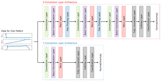 We trained the engine clutch engagement/disengagement anomaly detection model using a CNN by configuring the input/output structure as shown in Figure 10. As shown in the figure, the architectures with one and three convolution layers were constructed. In [74], the authors configured the channel for time-series data to enter the data into the convolution layer to classify time-series data. Similarly, we configured the channel for each target signal to enter the data into the first convolution layer. The output of the network is the normal/anomaly per pattern, as in the aforementioned MLP and LSTM. For input signals of the network, we matched the length of data per pattern in the same way as the MLP and LSTM, using Equation (1), and then entered the data into the network. The composition of layers for each architecture in Figure 10 is as follows. First, Table 6 shows the hyperparameter setting of the convolutional layer for each architecture. In the table, [w, h] of the filter size means [height, width (time axis)] of the filter, and [a, b] of the stride means [vertical step size, horizontal step size]. Because the input data is one-dimensional, the height of the filter size and vertical step size of the stride is always 1. We made the input size and output size of the layer the same by using zero padding. In the batch normalization layer, z-score normalization is conducted on input data for each channel. In the ReLU layer, the activation function shown in Figure 5c is applied to the input data. The max pooling layer performs downsampling by outputting a maximum value for a specific region (pooling region) of input data. The sizes of the pooling regions of the two max pooling layers of the 3-convolutional layer architecture were set to (1, 3) and (1, 4), respectively, and the stride values were also set to (1, 3) and (1, 4), respectively. Here, (w, h) of the pooling regions size means height, width (time axis)] of pooling region. The set values for each layer above were selected according to a general method or through trial and error.