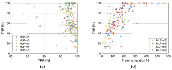 Training results of the MLP-based anomaly detection models: (a) TPR and TNR for each model training; (b) TNR according to training iteration.