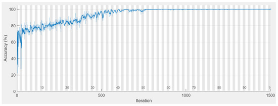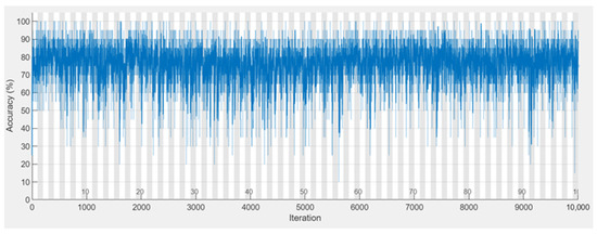 Figure 15 shows the accuracy according to the training progresses of LSTM-m2, and Table 10 shows the training results of the models per the LSTM layers and hidden units configured as shown in Table 5. The numbers 10–90 shown above the graph’s x-axis in the figure means the number of epochs. In Figure 15, we can see that the accuracy according to the training progress is oscillating between about 60 and 90% and not converging. Training LSTM is done by dividing the training data into several subsets and finding parameters that minimize the loss function for each training data subset. The reason for accuracy oscillating is optimized LSTM parameters for each subset do not converge and continue to change. This means that the LSTM cannot properly find the pattern of target input/output data. Accordingly, we can see that the accuracy per the models in Table 10 is also low. All training results show high TPRs but low TNRs.
