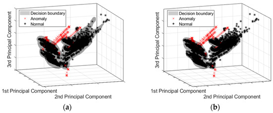 Figure 11 shown the engine clutch engagement/disengagement anomaly detection model training structure using one-class SVM. For effective training, we performed z-score normalization and principal component analysis (PCA). The one-class SVM model was trained with data dimensionally reduced to the principal component space through PCA. We used data projected into the three-dimensional principal component space because the principal component contribution analysis of the target signal showed that the cumulative contribution rate of the three principal components was 71–77%.