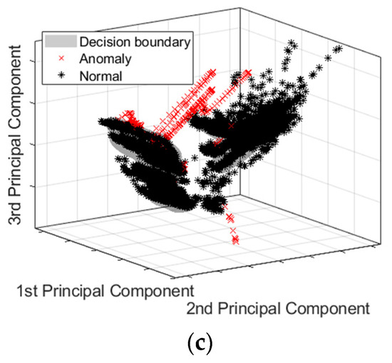 Decision boundaries of the one-class SVM-based anomaly detection models based on the outlier fraction: (a) outlier fraction = 0.01 [%]; (b) outlier fraction = 0.1 [%]; (c) outlier fraction = 1 [%].