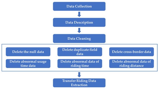 According to the above method, taking one day’s data as an example, this paper collected 142,500 riding data of shared bike transferring to rail transit from 622,000 order data. The amount of data extracted accounted for 22.91% of the total amount of data. Data collection steps in this paper are shown in Figure 1.