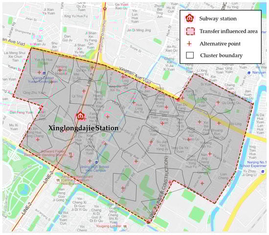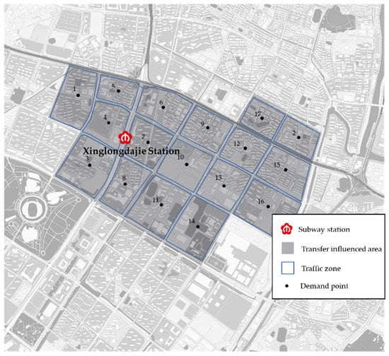 The Xinglongdajie Subway Station of Nanjing was used as a case to verify the model. The transfer-influenced area of the Xinglongdajie Station was determined, as shown in Figure 3. In order to systematically configure the facilities and simplify calculation, this study considered the structure of the grid-shaped road network in the area, divided the influence area of rail transfer into traffic zones, and selected the centroid of each zone as the travel demand point. The obtained traffic zone division result and the corresponding travel demand point are also shown in Figure 3.