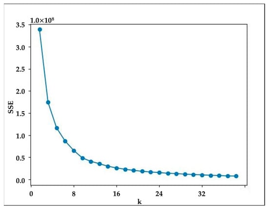 According to the prediction method of alternative facility points proposed above, this study performed two-dimensional spatial clustering on the bike-sharing order data, and iteratively calculated the sum of squares of two-dimensional spatial clustering errors under different k values. The corresponding result is shown in Figure 4. It clear that when K was greater than 24, the error sum of squares SSE tended to be stable. In order to increase the flexibility of the alternative facility location point planning, the K value was determined as 30. After debugging, the classification effect was perfect when all the order data coordinates were divided into 30 categories. Figure 5 shows the distribution of the alternative points of the bike-sharing facility. As a result, the area of the convex hull enclosed by the origin coordinates of each shared bike is about 0.16 square kilometers, which is approximately equal to a circle with a radius of 200 m, and its service radius is within the acceptable walking distance for travelers [].