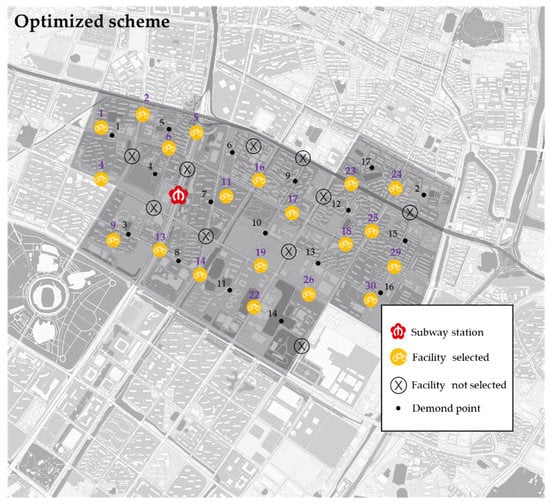 - Overall supply. The first-generation scheme was equipped with 16 shared bike facilities for a total of 477 shared bikes; the optimal plan was equipped with 20 facilities for 560 shared bikes. The optimal scheme increased the number of facilities compared to the first generation, which meant it could provide more shared bikes to meet potential transfer-ride demands.