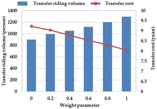In order to analyze the influence of the change of the weight coefficient of the objective function on the calculation results, the change trend of the transfer-ride volume and the generalized travel cost of transfer riding under the optimal scheme are calculated by changing the target weight from 0 to 1 (step length is 0.2), as shown in Figure 8.