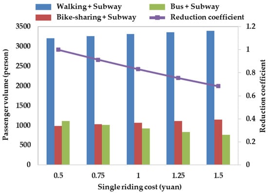 The cost of a single ride has a significant impact on whether travelers choose bike-sharing to transfer to rail transit. In order to analyze the influence of the change of single-ride costs on the calculation results, the single-ride cost of bike-sharing was brought to the lower-level model as an influencing variable, other parameters were controlled to keep them constant, and the changes of three modes of rail transit combined travel in the transfer-influenced area were obtained, which are shown as Table 6 and Figure 9.