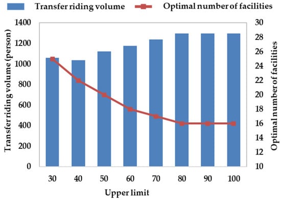 - With the increase in the upper limit parameter, the transfer-ride volume increases at first and then remains stable. When the upper limit parameter is less than 80, the maximum supply of the optimal facility relative to a travel zone cannot meet all the transfer-ride needs, and travelers need to choose the next best neighboring facility, which affects the transfer-ride volume. When the upper limit parameter is greater than 80, this indicates that the supply of single facility point is sufficient, the original problem is equivalent to finding the scheme with the largest transfer-ride volume and the least number of facilities in the influenced area. At this time, all travelers in different traffic zones can meet the demand of transfer and riding by choosing the nearest facility, without causing overload penalty and reducing the comprehensive benefit value; therefore, the optimal scheme will no longer change, and the volume will no longer increase.