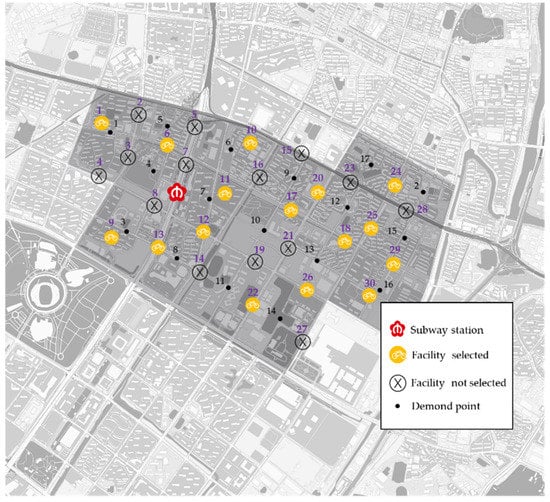 The model was solved according to the genetic algorithm process mentioned in the methodology section, and the first generation and optimal facility-layout schemes in the iterative operation of the algorithm were extracted. Figure 6 shows the spatial distribution of the first-generation scheme, and Figure 7 shows the distribution of the optimal plan of bike-sharing facilities. According to the calculation method for the initial allocation of bike-sharing facilities proposed above, the number of bikes allocated at each facility in the first generation and optimized schemes are shown in Table 3 and Table 4.