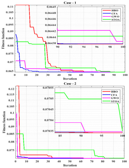 Parametric and non-parametric statistical measurements were performed for a more accurate comparison between the four optimization methods (HBO, CFA, GWO and STOA) on the basis of the acquired values of the objective function across a hundred individual runs for all analyzed cases. Parametric measurements comprise the lower value (Min.), maximum value (Max.) and mean of the target function, whereas the non-parametric measurements contain the median, relative error (RA), mean absolute error (MAE), standard deviation (SD), and efficiency. The efficiency here referred to the ratio of the lower value to the mean value of the goal function. For all four system scenarios, the results for statistical metrics for HBO, CFA, GWO, and STOA are shown in Table 10. On the basis of the results obtained, the proposed HBO in each case proved the best sensitivity and stability results compared to other optimization methods.
