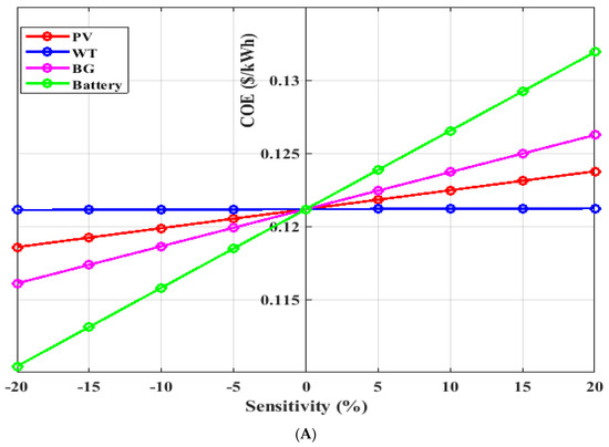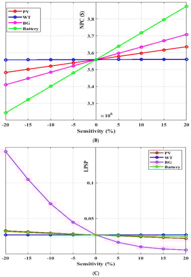 Figure 10A,B illustrate the effect on the COE and the NPC. As it can be noted that, at lower values of the specified parameters, both COE and NPC drop when the number of each PV panels, biomass generators, and batteries decreased. While, at a higher parameter values, the COE and NPC raise with increasing the number of each PV panels, biomass generators, and batteries. For the number of wind turbines, it can be noted that both the COE and NPC are nearly constant with the variation of the wind turbines number.