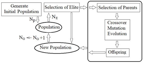 The GA is schematically shown in Figure 1. The first step is to create an initial population ( is the population size) and calculate the value of the objective function for every individual. ‘Elite’ is selected from the population and denotes a set of individuals with the best value of the objective function. From ‘Elite’, parents are selected, and the application of genetic operators to the parents creates a number of ‘Offspring’. For the ‘Offspring’, the value of the objective function is calculated again. The ‘Offspring’ and ‘Elite’ make up a new population. The ‘new population’ rewrites the ‘old population’ and starts a new cycle. The whole number of cycles is called (the number of generations). The total number of objective function calculations was used to assess the efficiency of the algorithm.