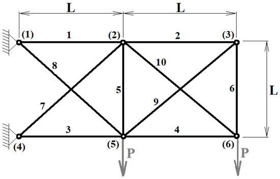 The methods presented in Section 2.1, Section 2.2, Section 2.3 were tested on a benchmark example. As the benchmark for verifying the presented optimization algorithm, a 10-rod truss structure taken from [26] was used (see Figure 2).