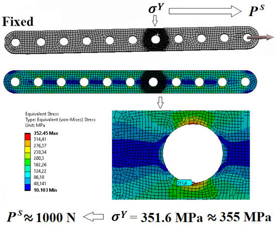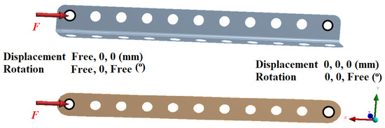 A linear elastic material model (Appendix A, [43]) was used for all simulations. Five materials were selected for the design of the arm. The material properties are shown in Table 3, where E is Young’s modulus, is Poisson’s ratio, is yield stress and is density.