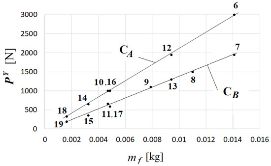 The resulting values , and describe the behavior for a rod, which is defined by a sorting length and loaded by a sorting force . is an extension of the rod, is the maximum force allowed in the rod and is the weight of the rod. The resulting values , and always contain two component parameters, see Equation (7). The value is not the actual length of the j-th component but the sorting length, which is the same for all components. Similarly, the value of is not a force acting on the j-th component, but a value common to all components used to classify them. The values = 100 mm and N were chosen with respect to Section 3 to show where the values of and are placed.